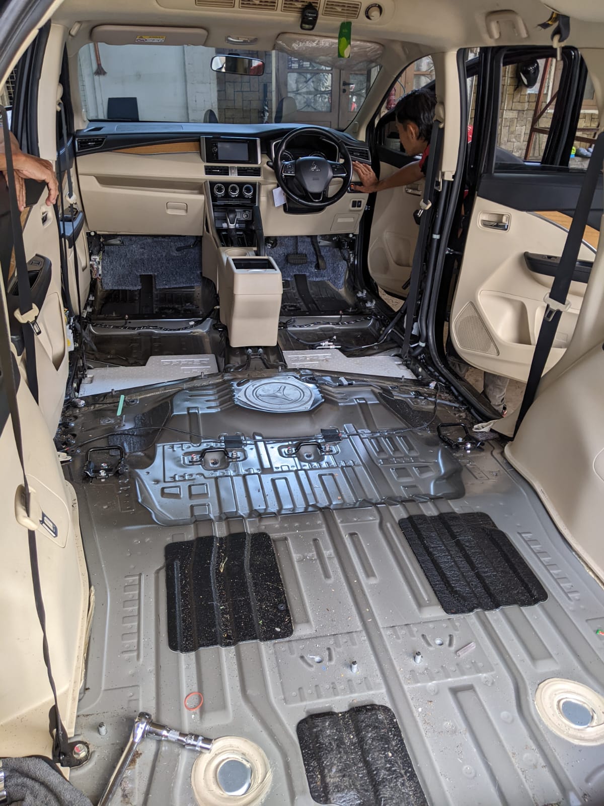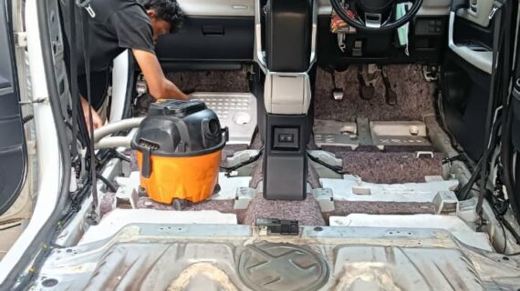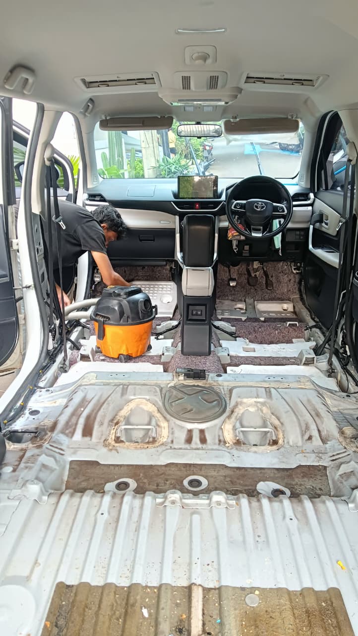 Vacum dan pencucian dengan teliti di semua area lantai dasar, doortrim, plafon, seatbelt, dashboard, jok, dan karpet.